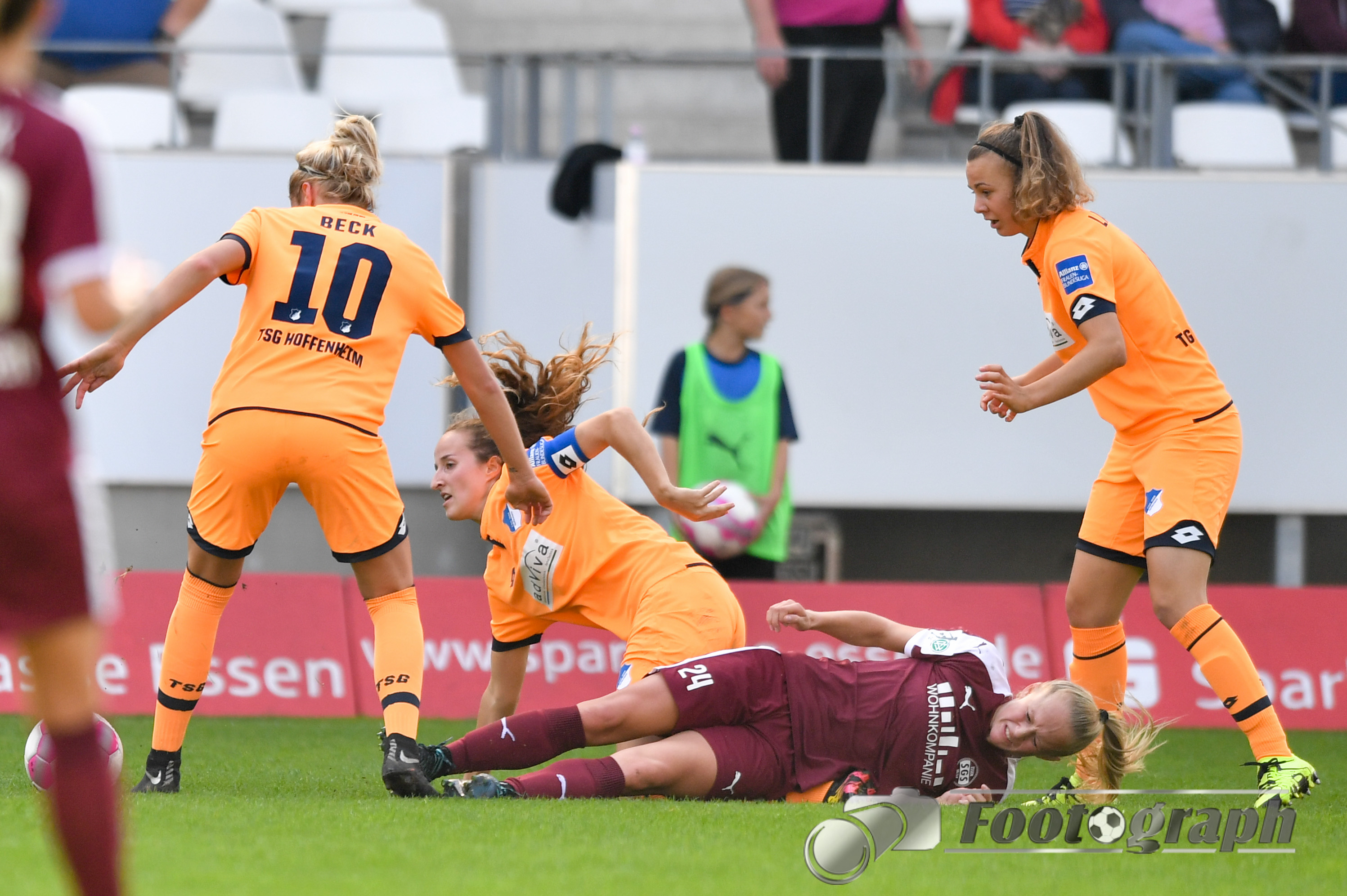 - Linda Dallmann (SGS, 10) im Zweikampf mit Leonie Pankratz (TSG 1899 Hoffenheim) (21) Fabienne Dongus (TSG 1899 Hoffenheim)
