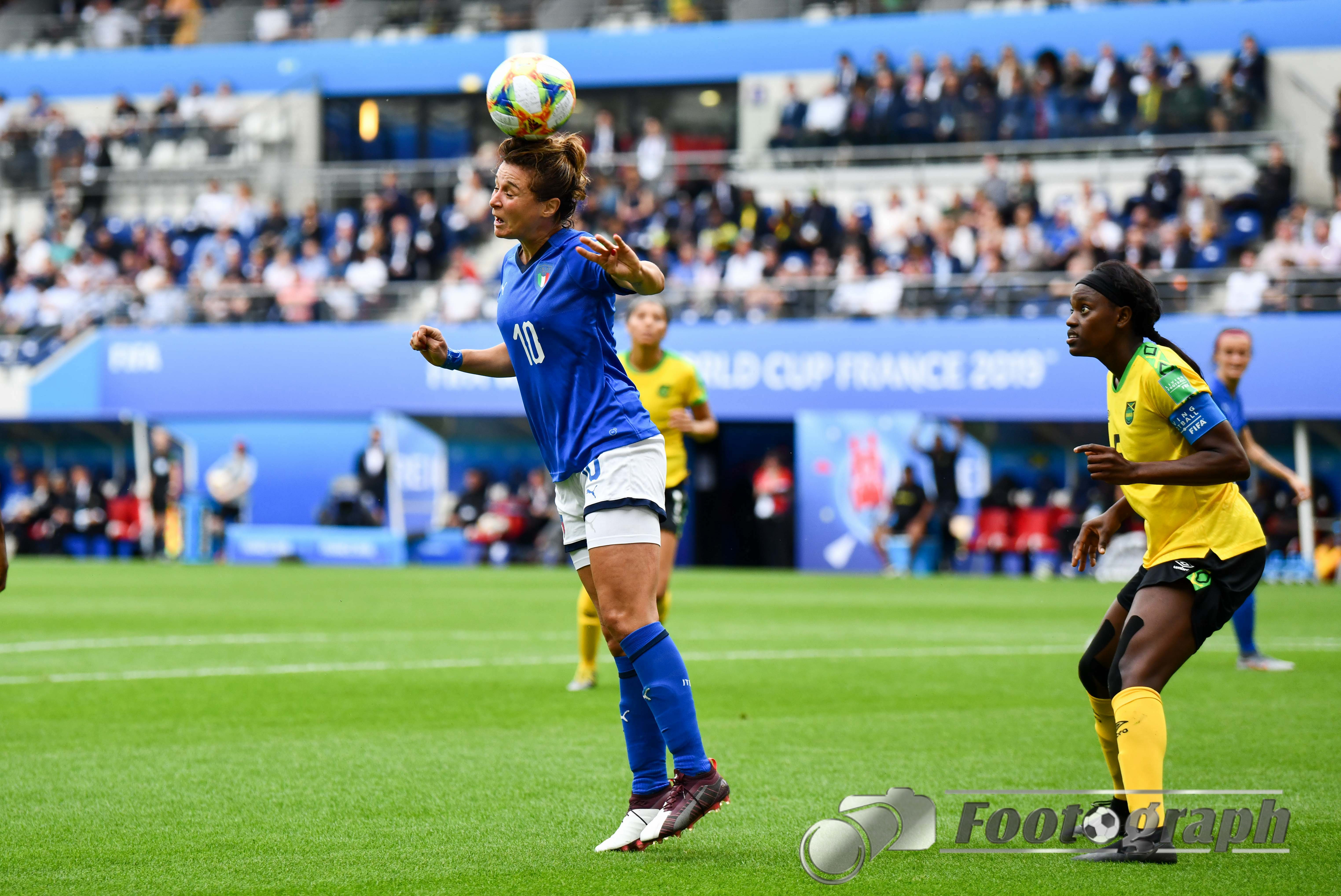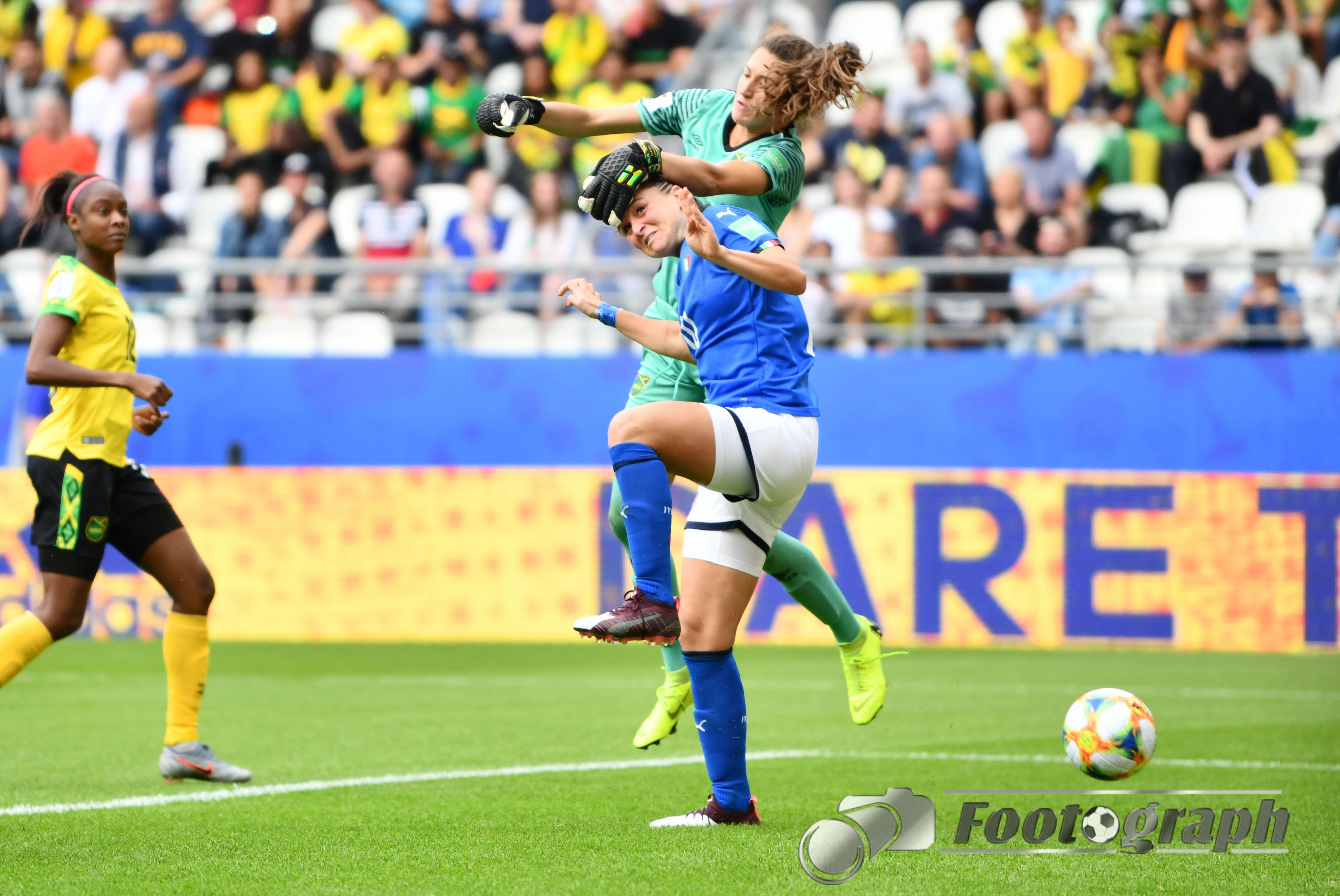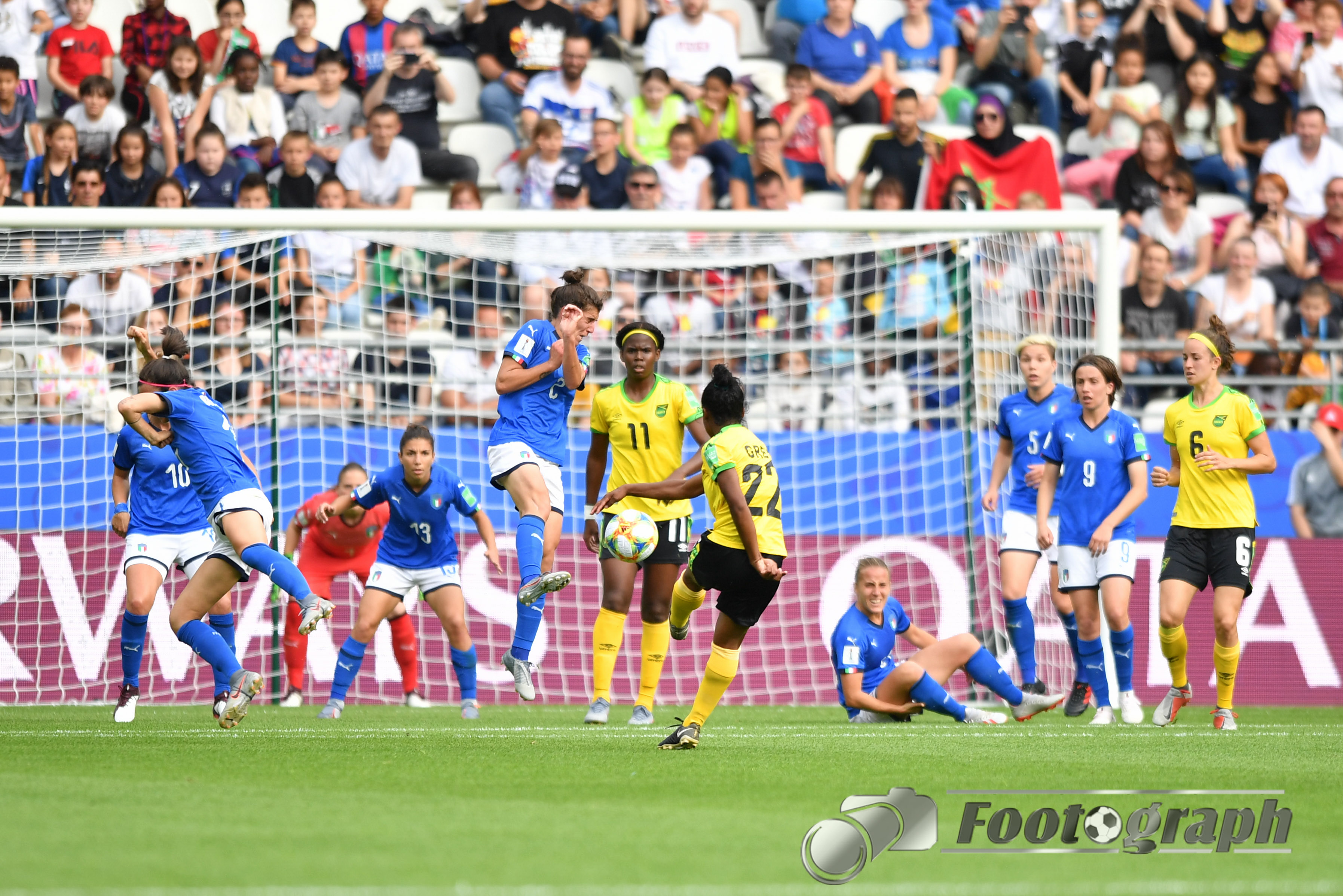 - Cristina Girelli (Italien) (10) köpft an Sydney Schneider (Torhüterin, Jamaika) (1) zum 0:3 vorbei – Ihr Hattrick