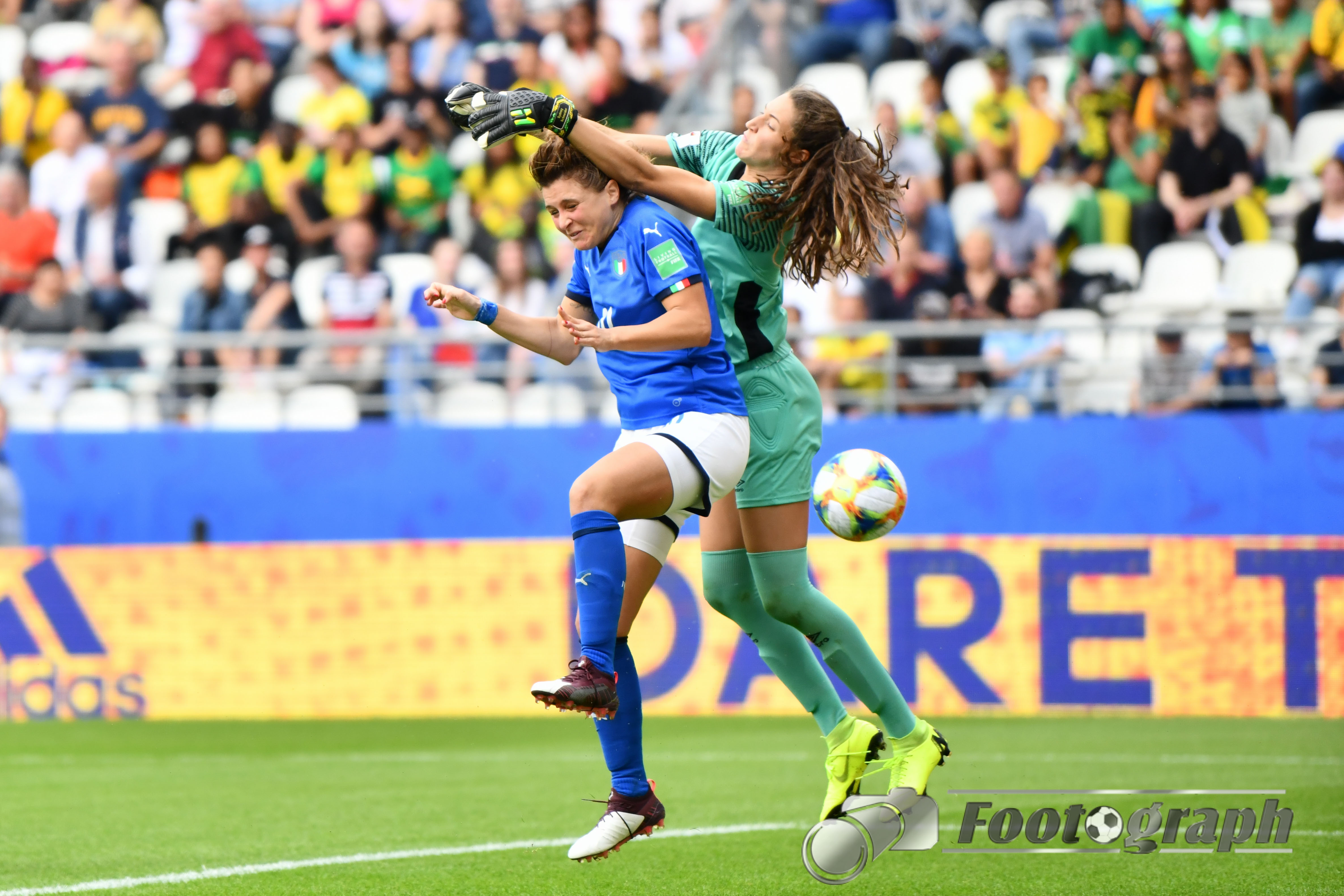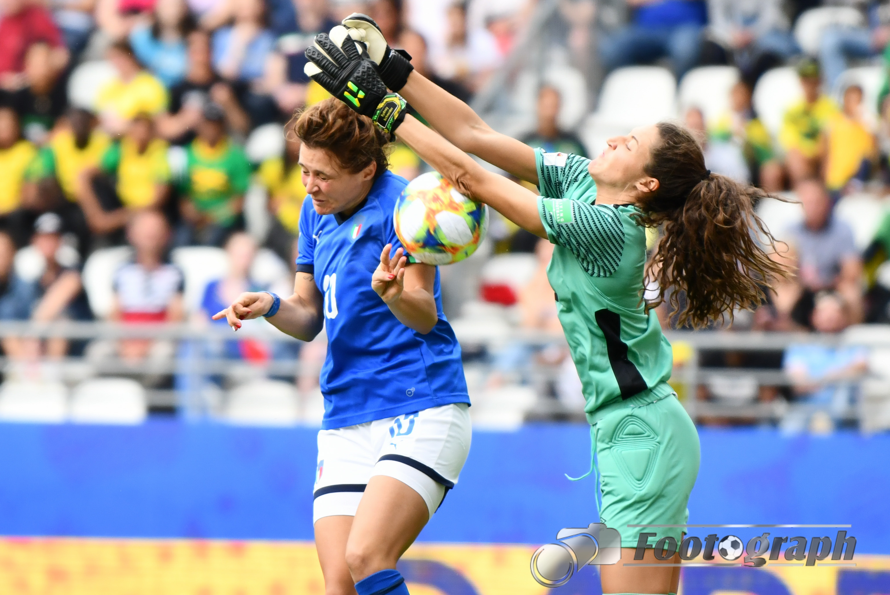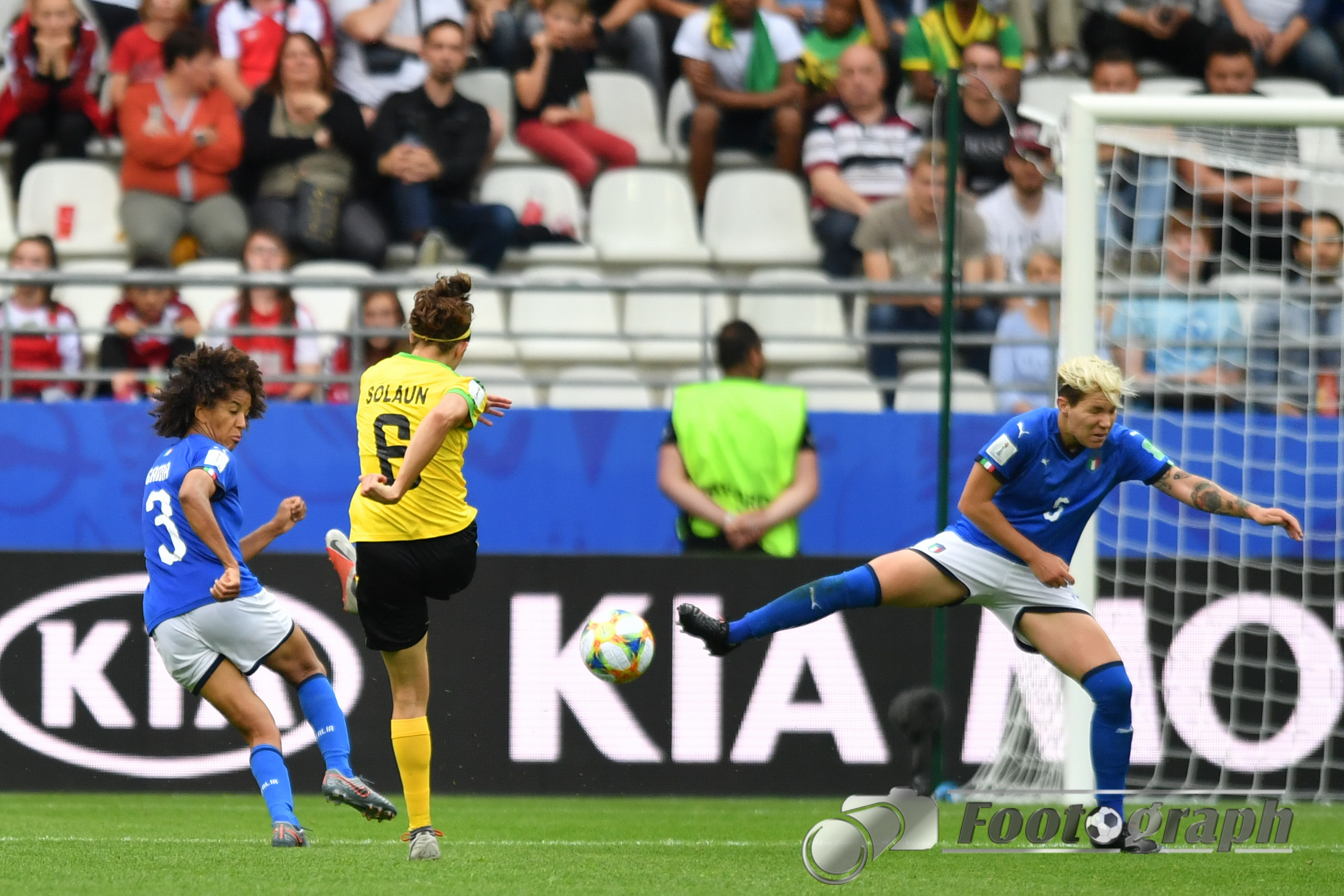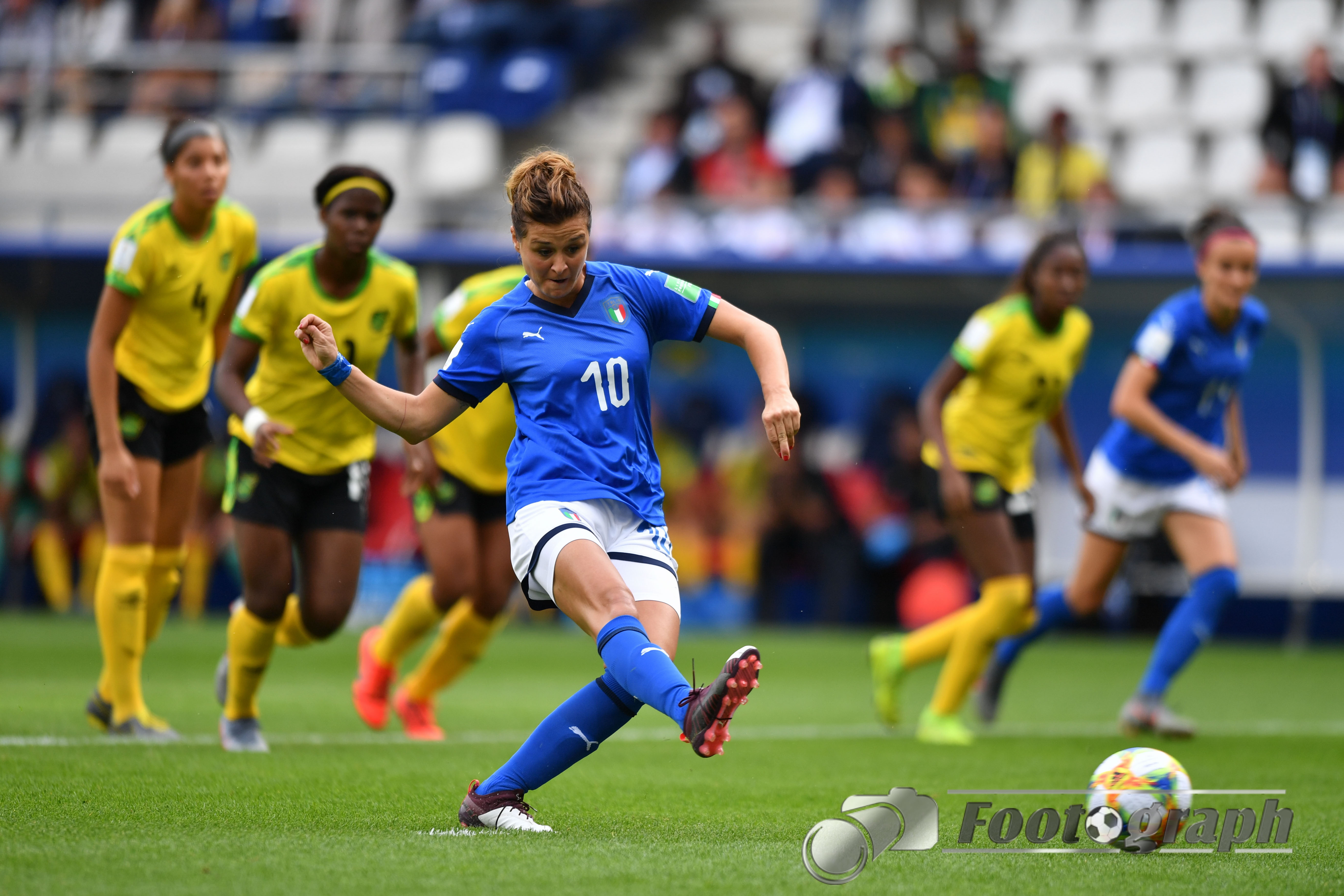 - Cristina Girelli (Italien) (10) köpft an Sydney Schneider (Torhüterin, Jamaika) (1) zum 0:3 vorbei – Ihr Hattrick
