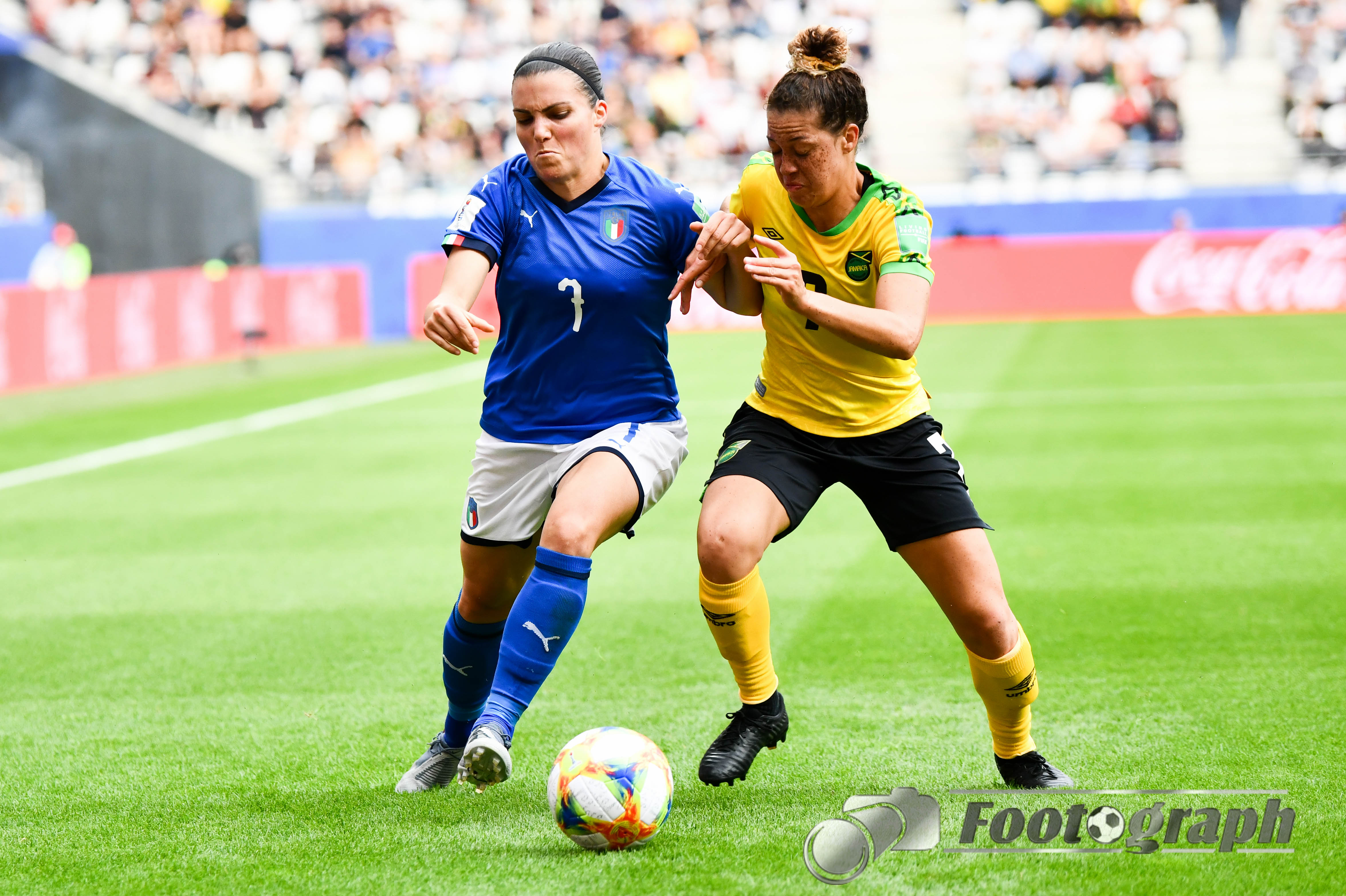 - Zweikampf, Spielszene, Duell, duel, tackle, tackling, Dynamik, Action, Allyson Swaby (Jamaika) (17) mit zu hartem Körpereinsatz an Barbara Bonansea (Italien) (11) – Folge Elfmeter Italien
